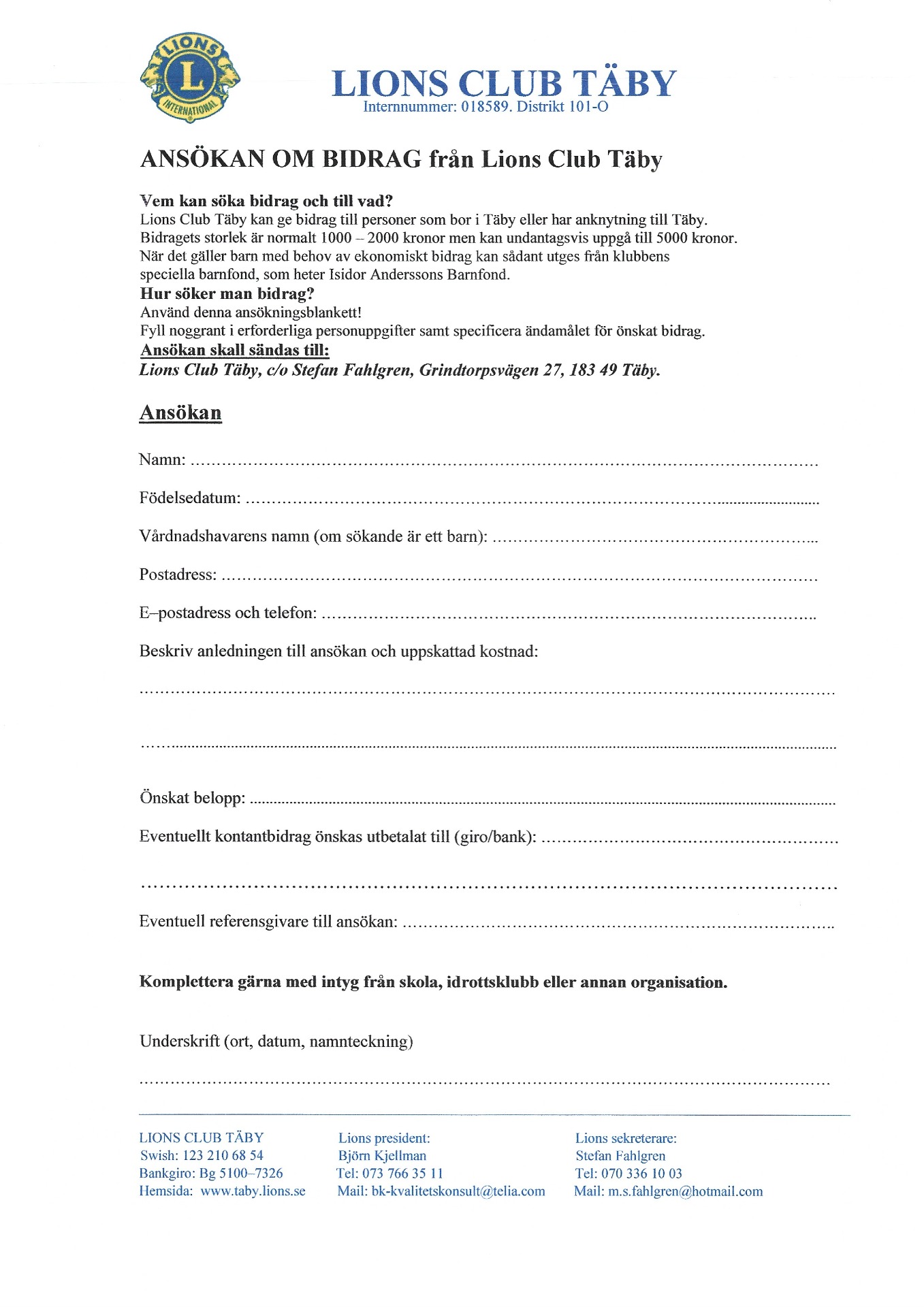 ANSÖKAN OM BIDRAG från Lions Club Täby